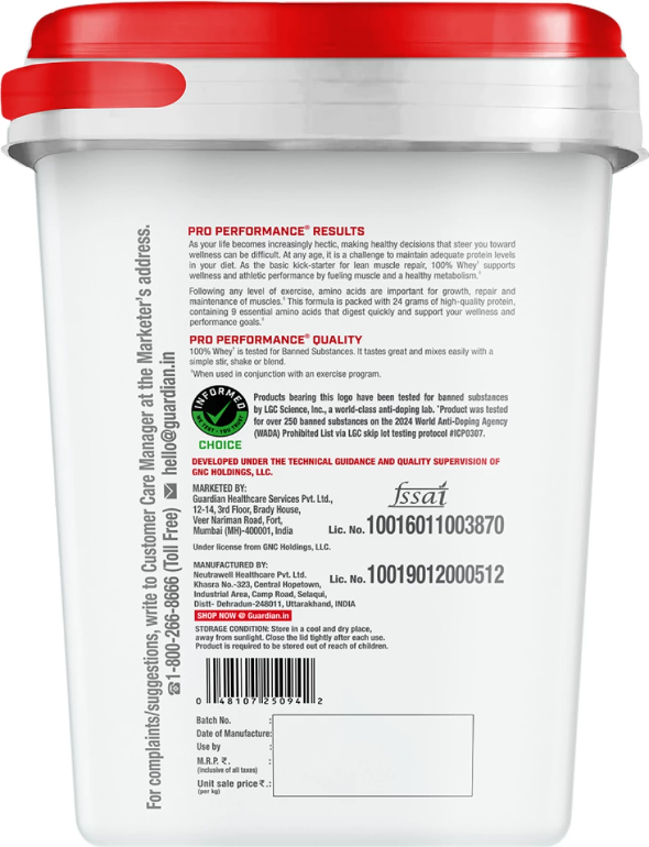 Take the next big step towards fitness excellence with the GNC Pro Performance 100% Whey Protein. Formulated to be 100% pure, this high-quality whey effectively energizes the body and improves your endurance. In addition, it is instantized to promote easy absorption and better metabolism. Each scoop contains 24gms of concentrated protein, which effectively takes care of your daily protein needs. Plus, the formula has 5.5gms of BCAAs that help build lean muscles and reduce muscle cramps & fatigue during your super-active workout sessions. GNC's Pro Performance 100% Whey is also packed with 9 essential amino acids that expedite muscle recovery. For digestion comfort, this whey is formulated with special digestive enzymes and has zero gluten for easy digestion. Furthermore, it has a yummy flavor for a savory taste. Moreover, the formula has no added sugar for a health-friendly whey powder. GNC's Whey is World Anti-Doping Agency (WADA) approved and Informed Choice certified.