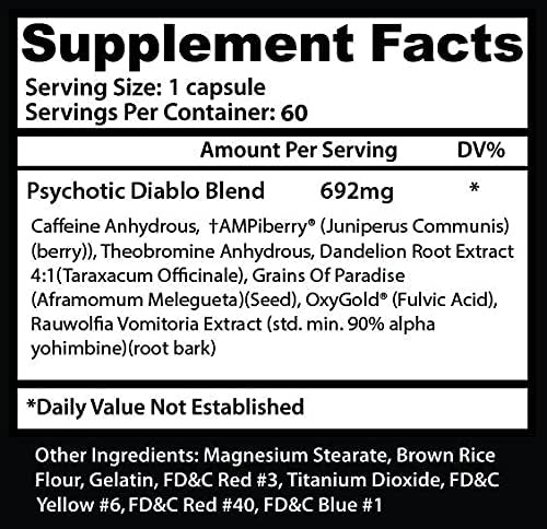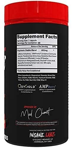 INSANELY FORMULATED. Once again, Insane Labz keeps pushing the limits. Psychotic Diablo is clinically formulated with Theobromine Anhydrous to boost cognitive function, Dandelion Root Extract decrease water retention, Grains of Paradise to target visceral fat and our patented AMPiberry and OxyGold to increase absorption and provide clean energy. Paired with an INSANE diet plan, Psychotic Diablo will help you meet your weight loss goals!