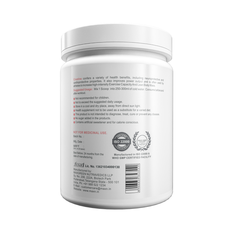 Creatine from MaxN is a natural substance, which turns into creatine phosphate in your body. A substance called adenosine triphosphate (ATP) is made from creatine phosphate. ATP is the energy source for muscle contractions.Creatine confers a variety of health benefits, including neuroprotective and cardio protective properties. It also improves power output and is often used by athletes to increase high-intensity exercise capacity and lean body mass.