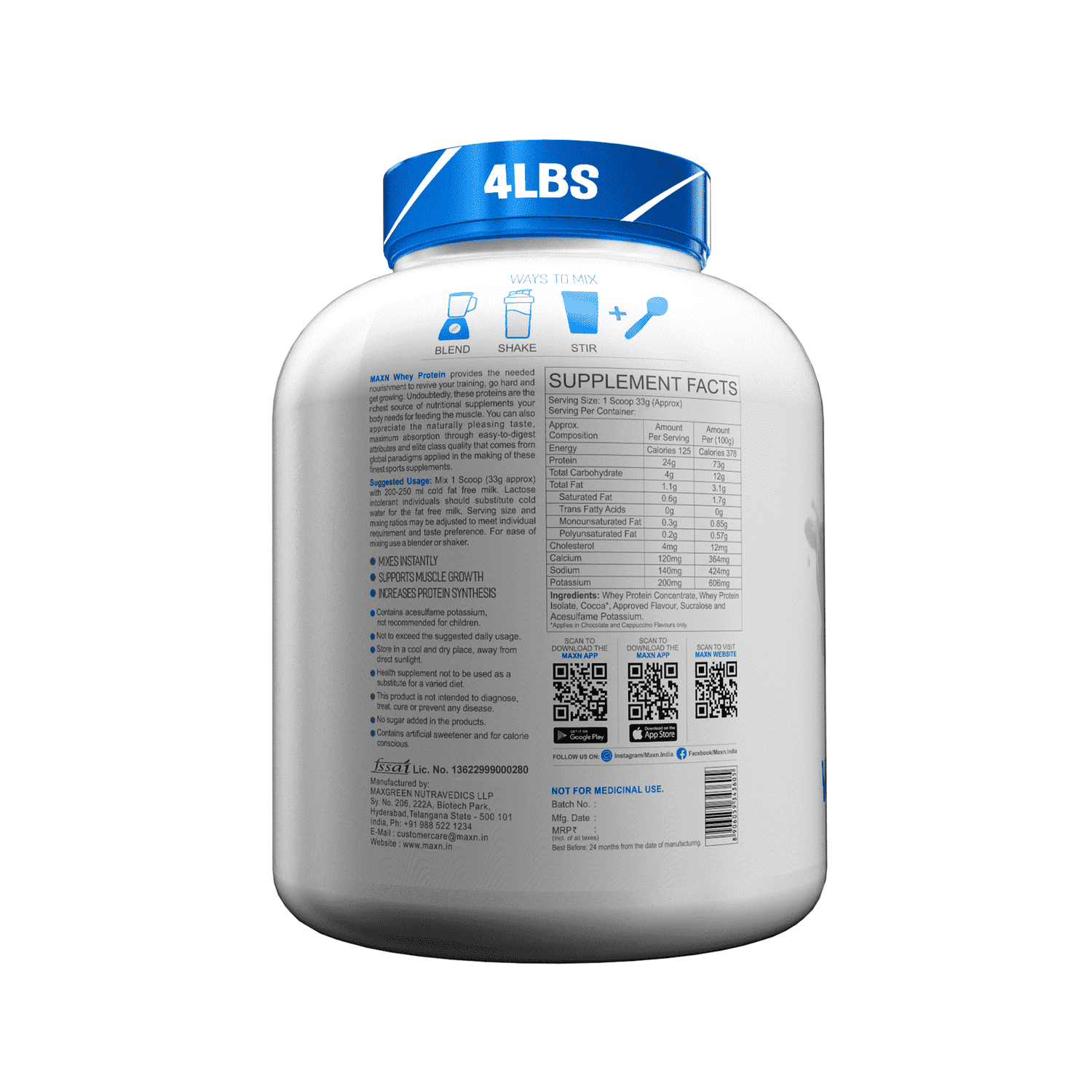 Whey protein is derived from curd while making cheese. MAXN (r) Whey Protein gives you the much needed nourishment to train hard and grow your muscles. The flavours are natural and the protein itself has a high absorption rate and is easily digestible having used international ingredients.