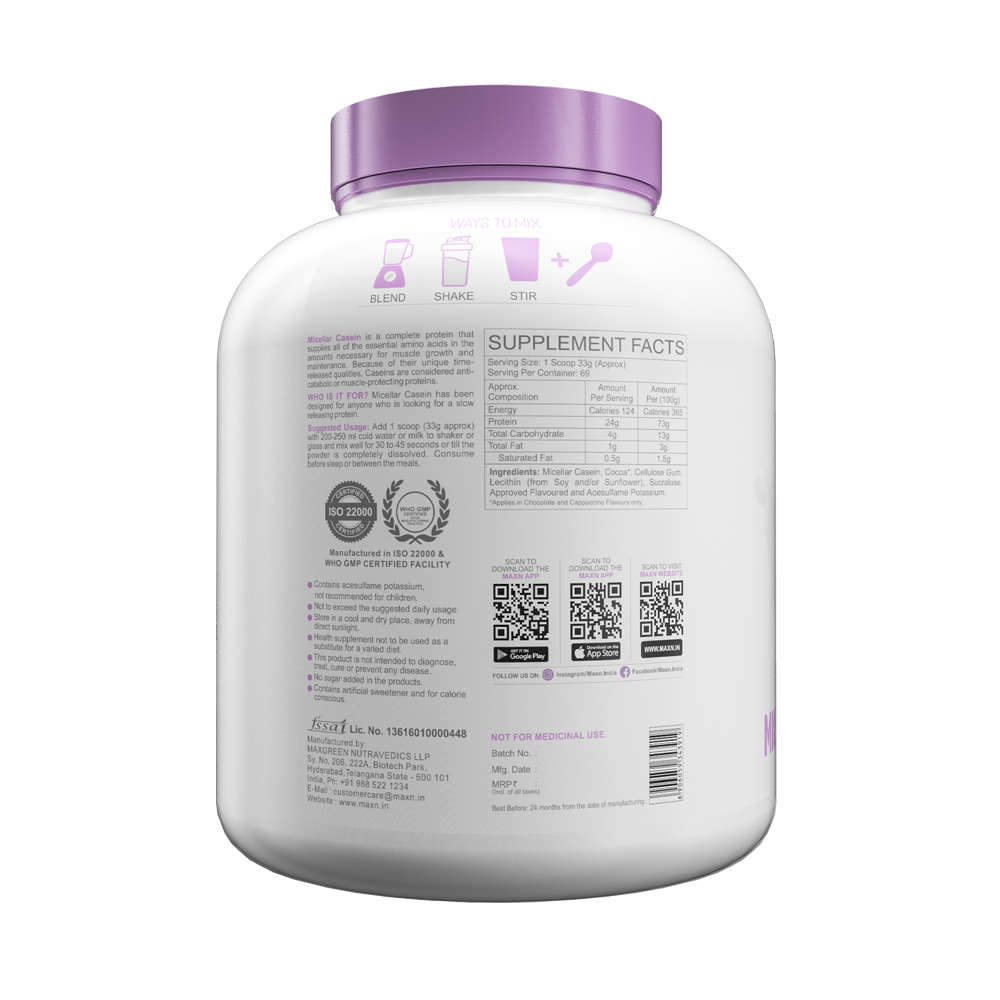 Maxn’s Micellar casein high-quality protein powder is made from milk that has been specially processed to remove the fat and lactose, leaving behind a concentrated source of protein. Micellar casein has a range of benefits for those who are looking to improve their health and fitness, support immune function, improve bone health, and reduce inflammation. Casein is most beneficial when taken at night before bed, as it will break down slowly while you sleep and provide your muscles with amino acids throughout the night.