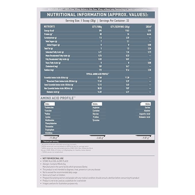 FIRST-RATE AMINO PROFILE: MuscleBlaze 100% Clean Raw Whey Concentrate provides optimal protein synthesis and supports muscle growth & recovery by offering a comprehensive array of amino acids, which includes 5.2 g of naturally occurring BCAAs, 11.2 g EAAs and 4.2 g Glutamic acid in every 30 g serving