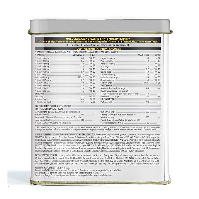 JOINT BLEND: When you are an advanced gym-goer, you have no room for joint discomfort, pain, or inflammation. MuscleBlaze Biozyme Daily Multivitamin for Men contains a joint blend that assists in mobility, flexibility and upkeeps the health of your joints