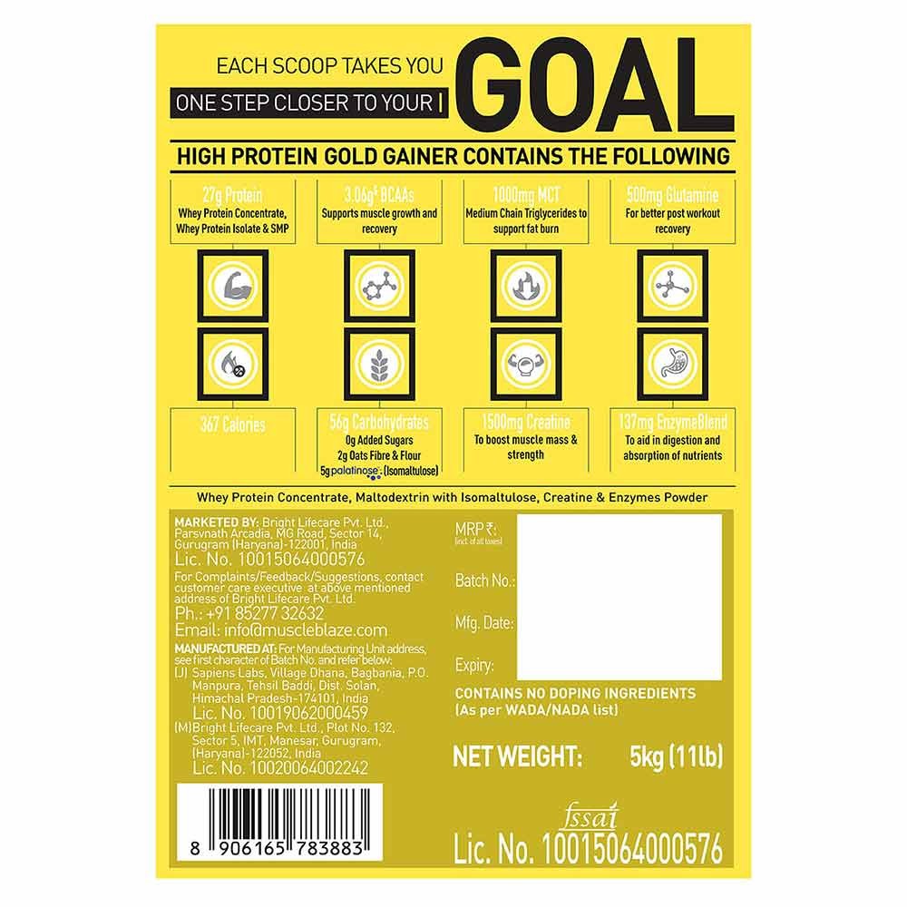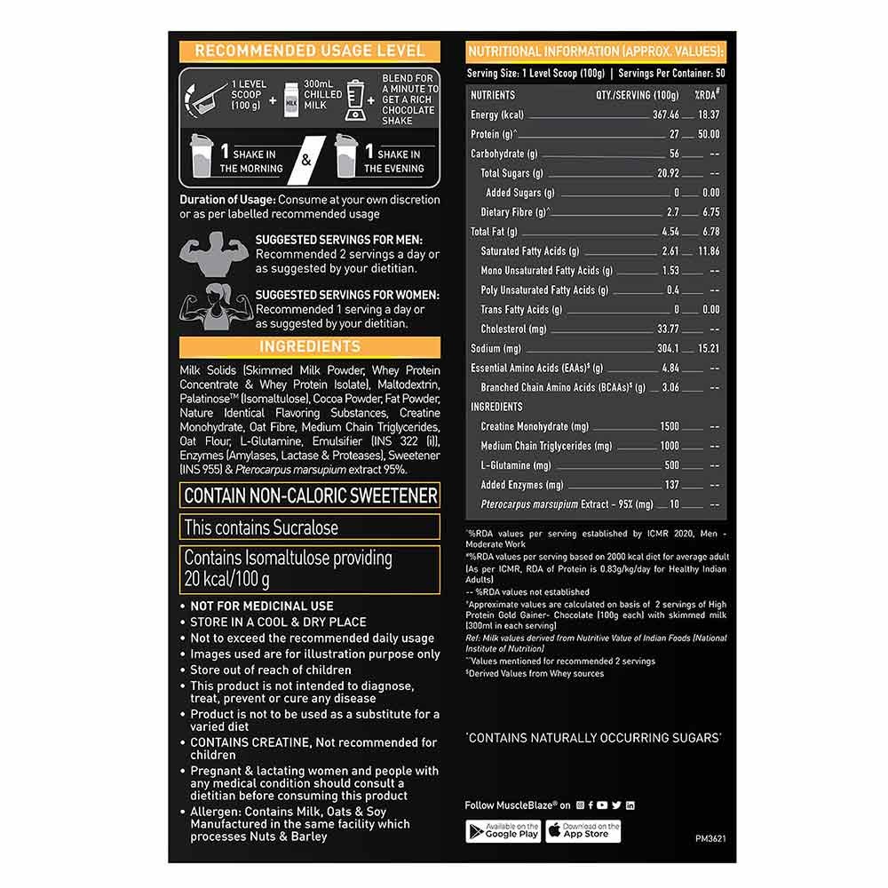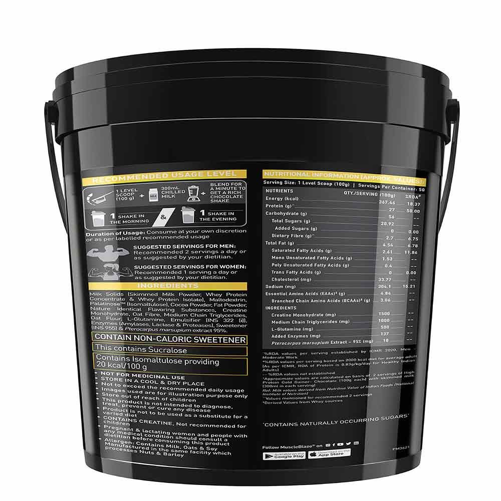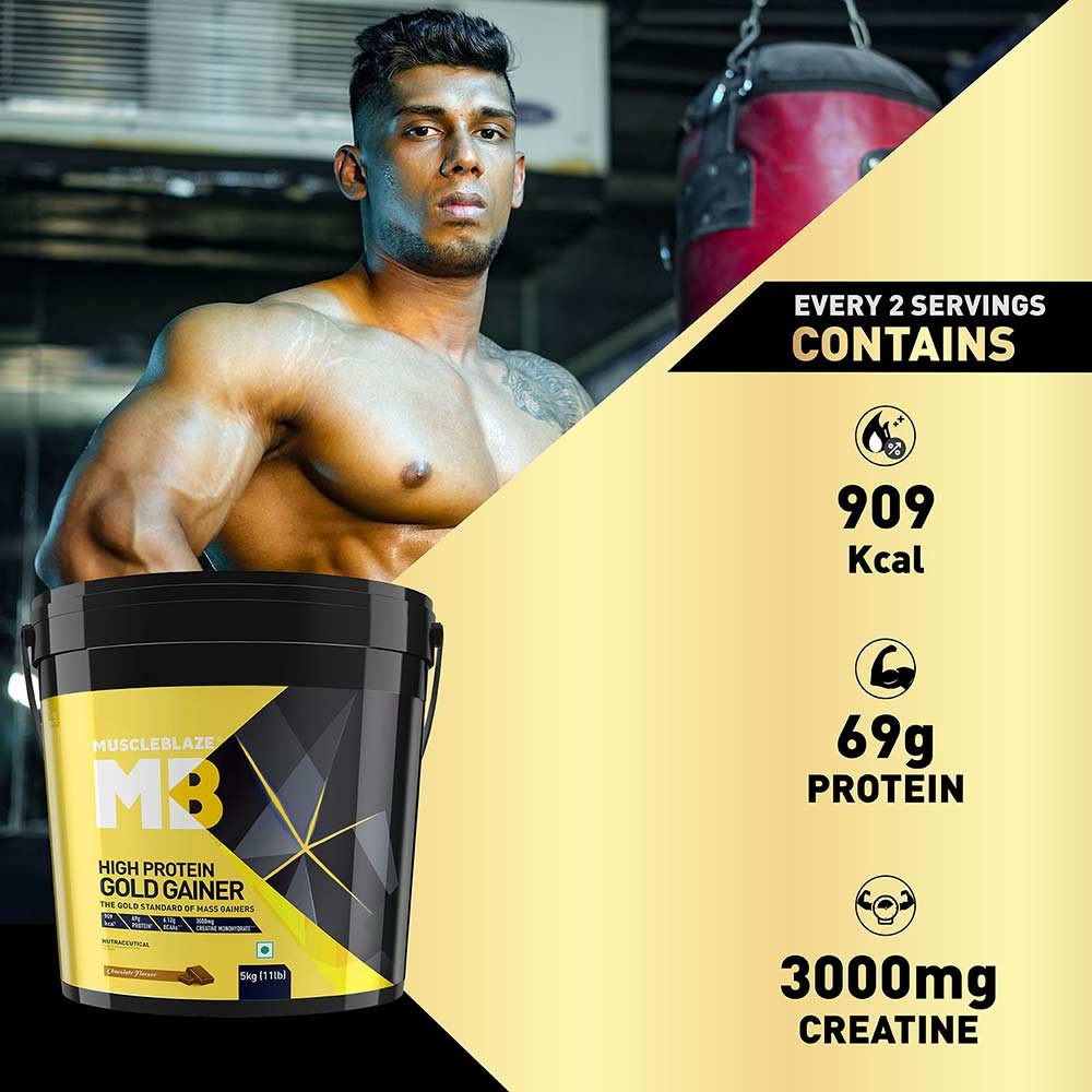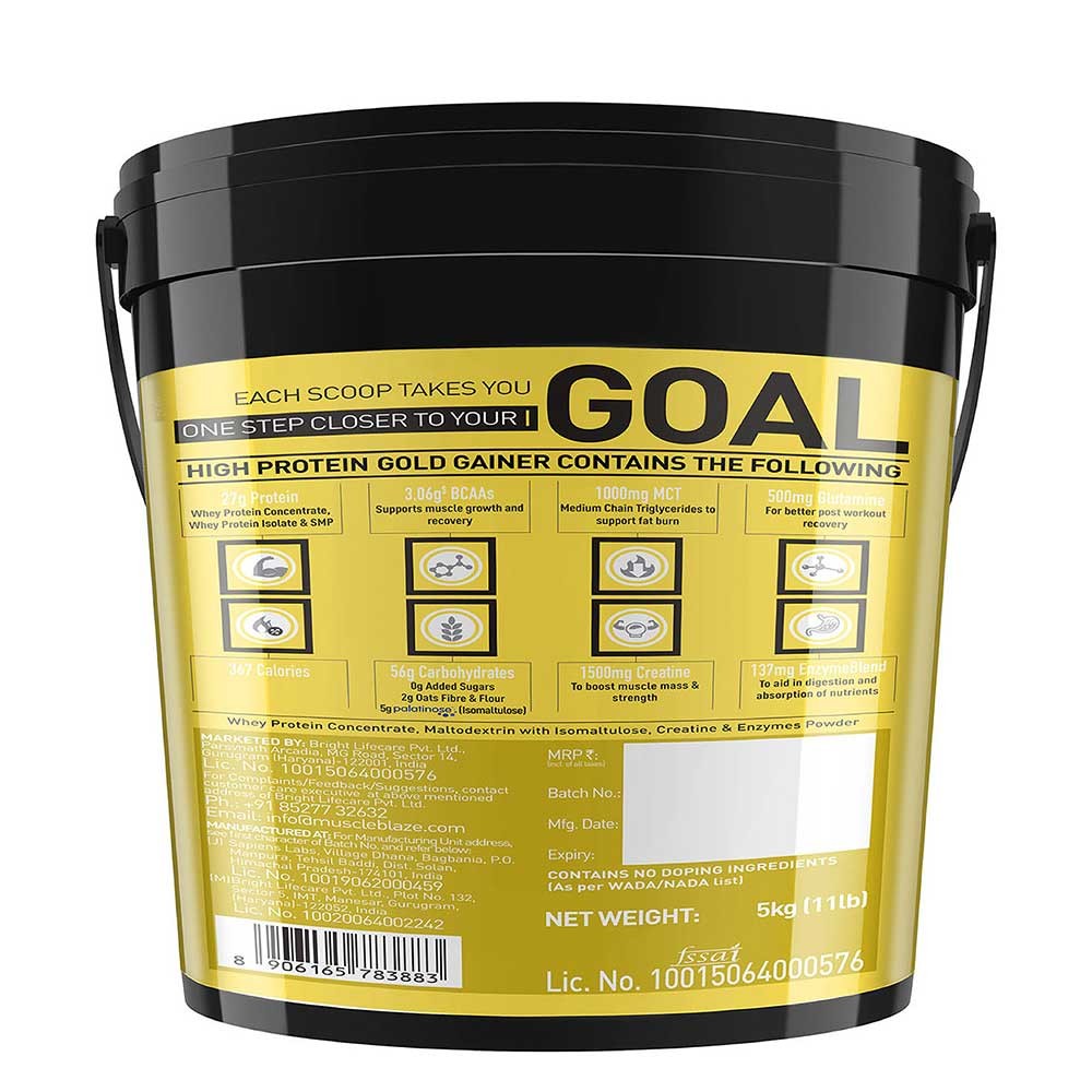 HIGH-QUALITY PROTEIN: MuscleBlaze High Protein Gold Gainer is exquisitely formulated for bodybuilders and athletes with high-quality protein for both quick and slow delivery of energy. It contains whey protein concentrate and whey protein isolate & provides 69 g protein in 2 servings with milk
