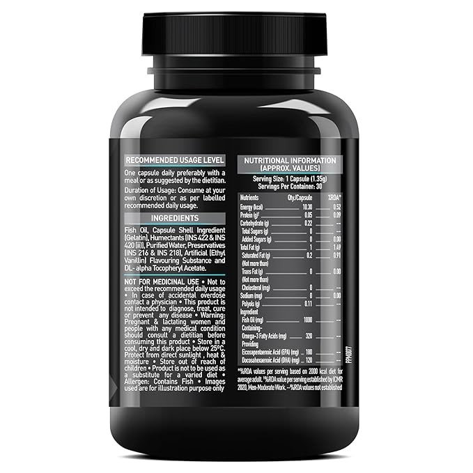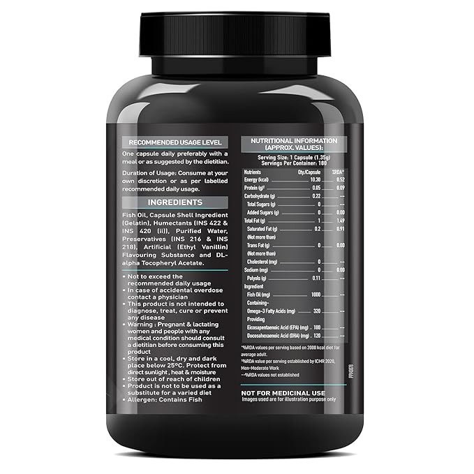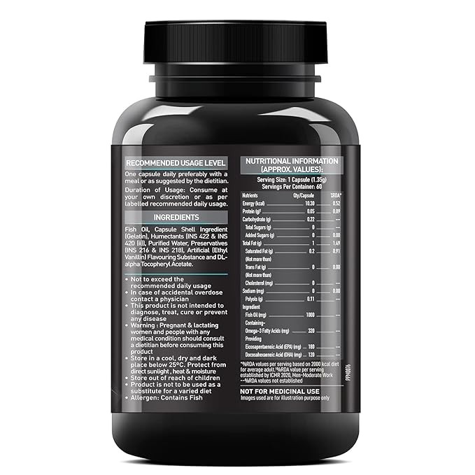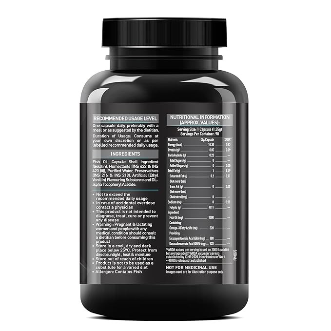 RECOMMENDED DOSAGE- Consume one omega 3 fish oil capsule 1000mg with water, two or three times a day, preferably with a meal or as suggested by your dietitian