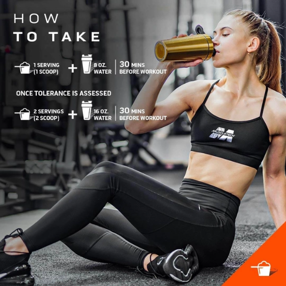 To assess your tolerance, take 1 serving (1 scoop) with 240ml. of cold water and drink it about 30 minutes before your daily workout. Once tolerance has been assessed, increase the dosage to 2 scoops mixed with 480ml. of water before working out. Do not exceed 2 scoops within a 24-hour period. Maintain an adequate state of hydration during use.