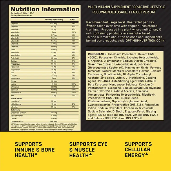 Optimum Nutrition Multivitamin for Men is designed to fill gaps in micronutrient intake, particularly for men with active lifestyle. With 26 Vitamins and Minerals for bone health, immunity, eye health, metabolism, Amino Acids for Muscle Health, and Antioxidants (Green Tea Extract, Beta Carotene, Lutein, Lycopene) to fight free radicals and for immunity.