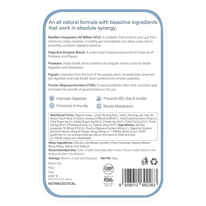Advanced German Molecualr Science: Fast Acting and All Natural melts Healthy Gut Digestive Balance is 95% more bioavailable than traditional tablets/capsules/sugar filled gummies. Its Patented Molecular technology converts plant extracts into nanoparticles and the sublingual quick dissolve delivery system ensures the actives are directly released into the bloodstream for complete absorption. melts delivers a healthy dose of Plant Based Probiotics and Digestive Enzymes.